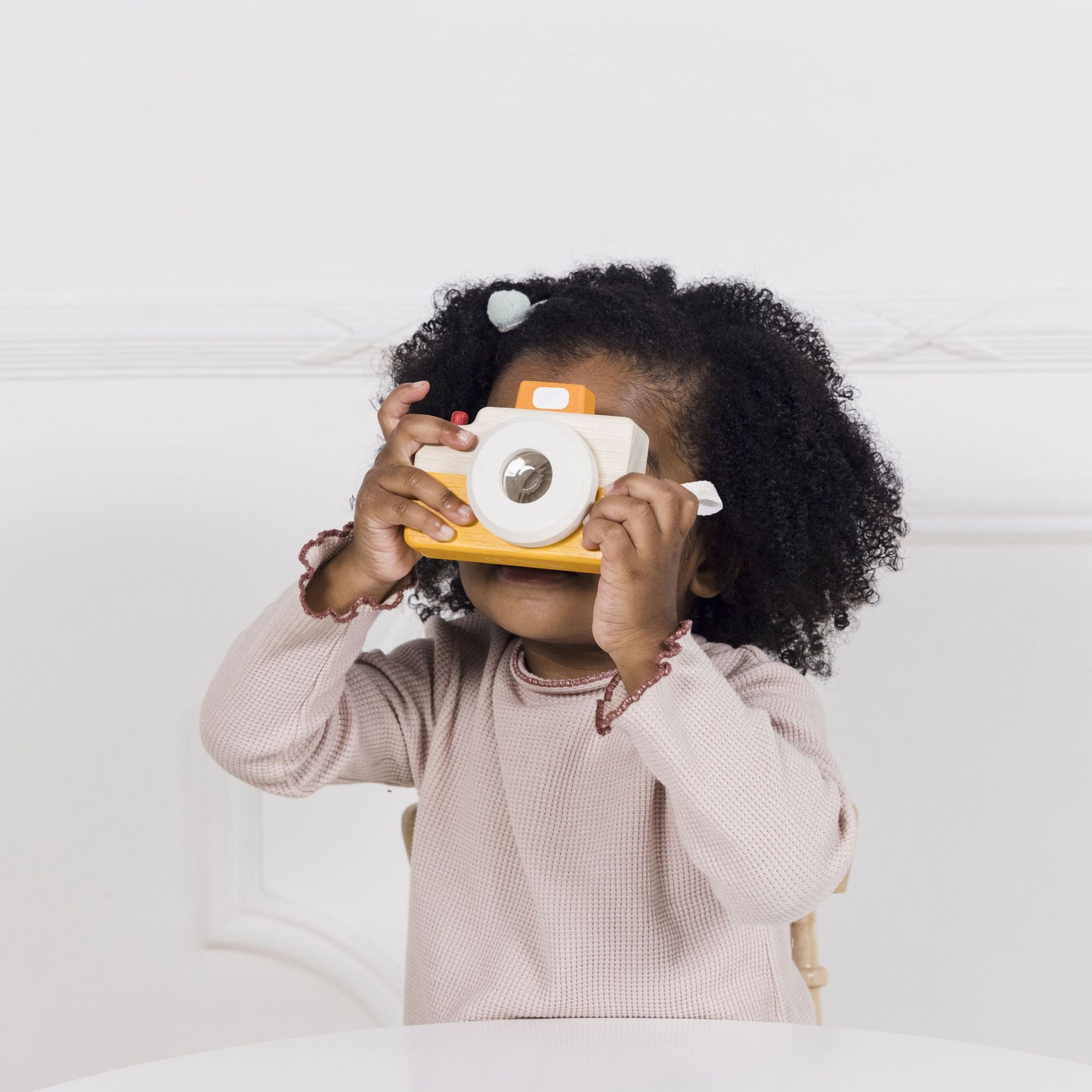 Zeg kaas! Een leuke speelgoedcamera met vier camera-instellingen, een handige draagriem, een roterende cameralens met bewegende caleidoscoop en een drukknop om denkbeeldige foto's te 'maken'. De camera is voorzien van heldere geschilderde kleuren op waterbasis en is gemaakt van natuurlijk rubberhout.