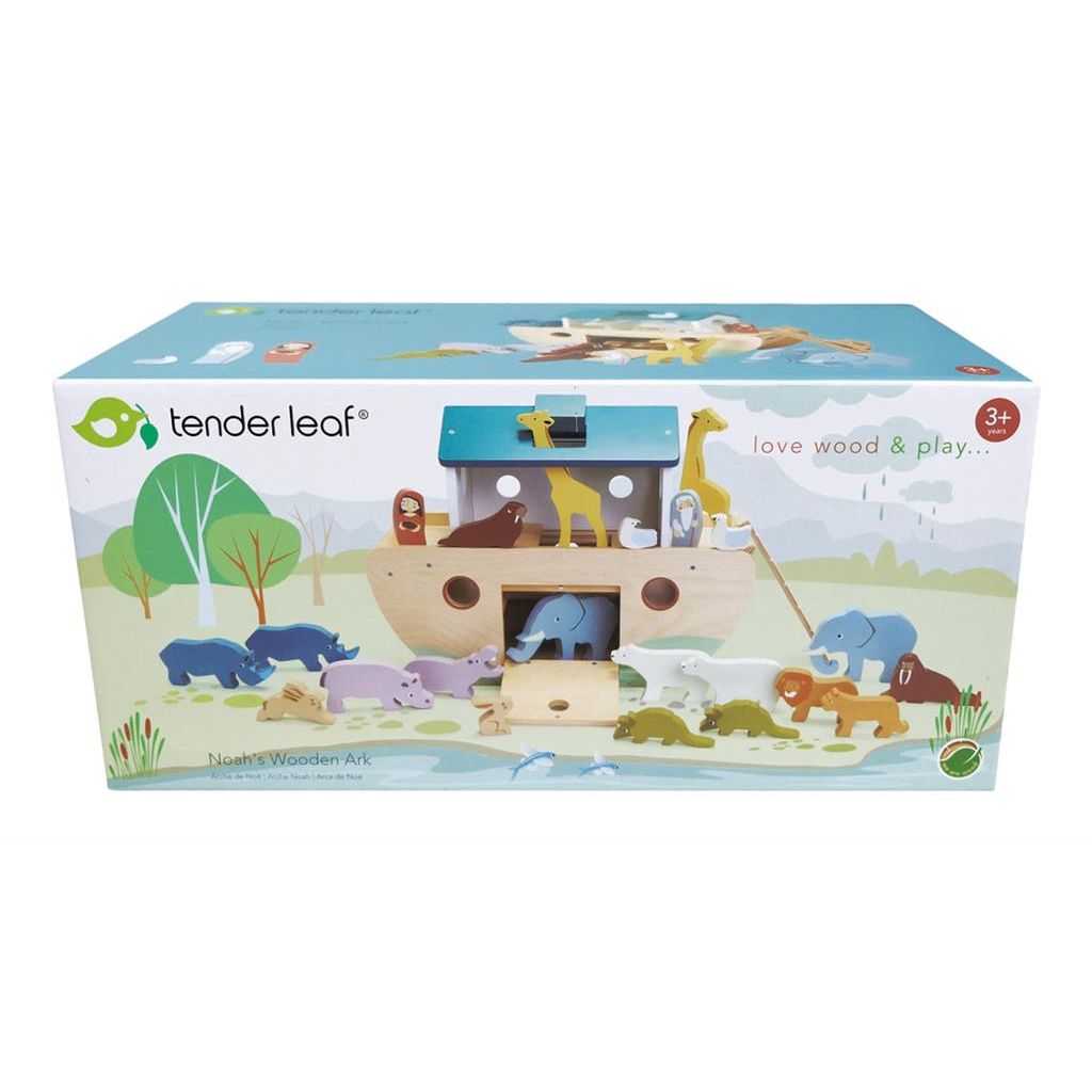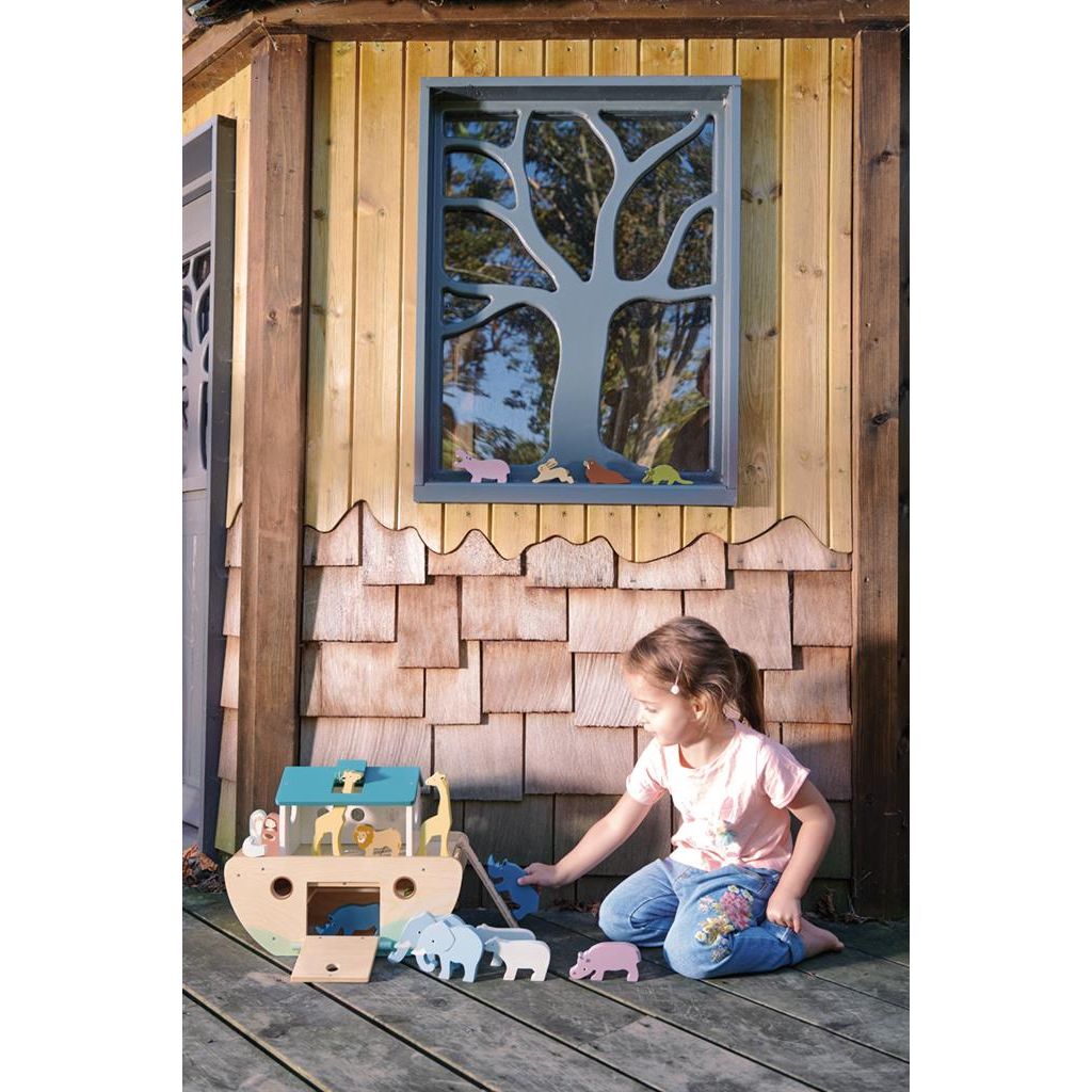 Onze milieuvriendelijke grote ark heeft een brede deur aan één kant en een bovenluik dat omhoog gaat om een dubbeldeks interieur te onthullen. Een uiteinde schuift naar buiten voor gemakkelijke toegang tot alle dieren, en een ladder maakt het gemakkelijk voor ze om er twee aan twee in te klimmen. 10 dierenparen en meneer en mevrouw Noah.
