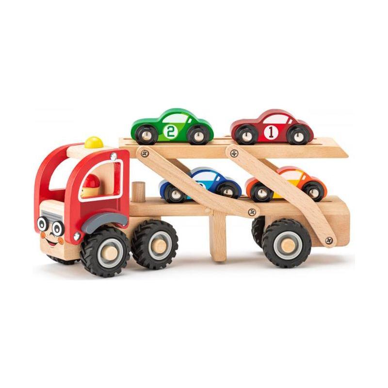 Deze vrachtwagen is wel heel erg blij met zijn werk. Het vervoeren doet hij met een bewegende aanhanger waar vier auto's op passen. De aanhanger is los te koppelen en het geheel is helemaal van hout gemaakt. 27x8x11cm