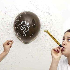 Gender Reveal? Met deze set heb je alle basisbenodigdheden in een handig blikje bij elkaar. 2 Zwarte ballonnen, blauwe confetti, roze confetti, speld en 2 roltoeters. Tadaaaaa!
