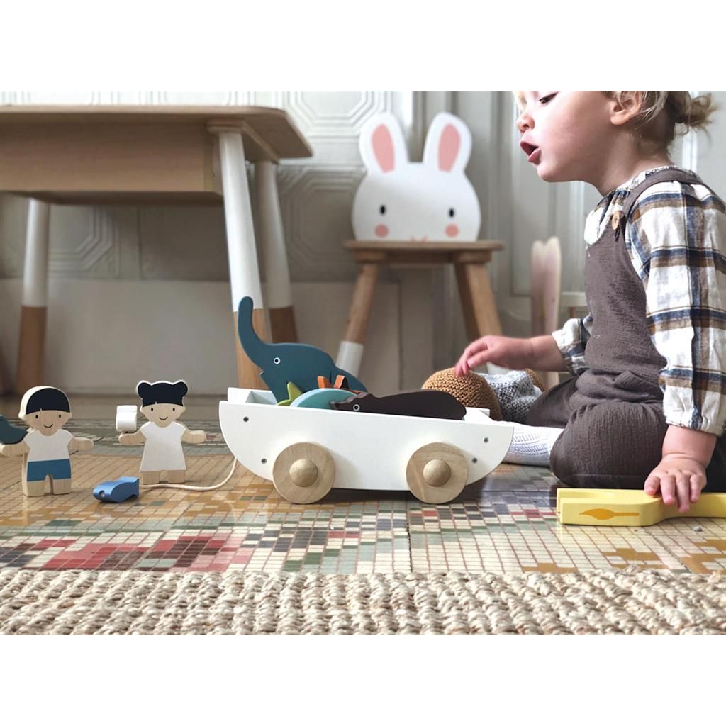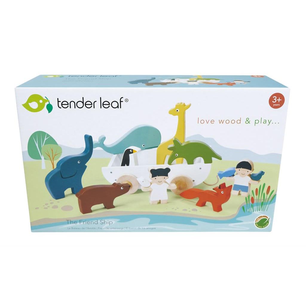 Allemaal aan boord van het schip Friend! Een perfect cadeau voor elke peuter, deze set is gemaakt van duurzaam rubberhout en is geschilderd in zachte eigentijdse kleuren. De dierenset bestaat uit een olifant, giraffe, miereneter, walvis, vos, pinguïn, beer en een jongetje en meisje met elk een muisje en vogeltje. Trek ze mee in hun schattige witte boot met wielen van natuurlijk hout.