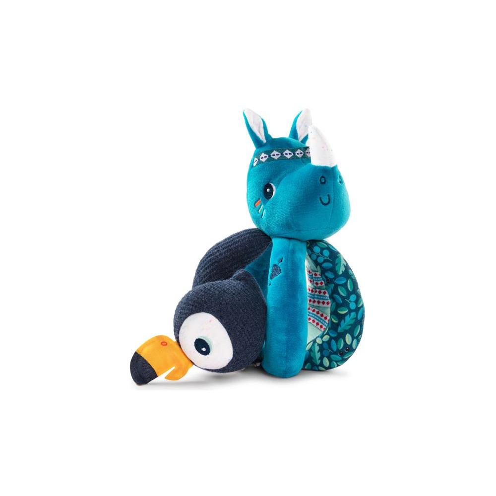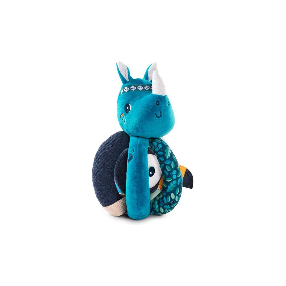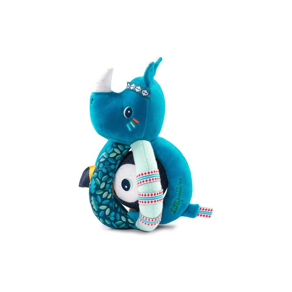 Een originele rammelaar, makkelijk vast te grijpen voor kleine handjes. Een klein vriendje schuilt tussen de handgrepen door. Vanaf 6 maanden.
