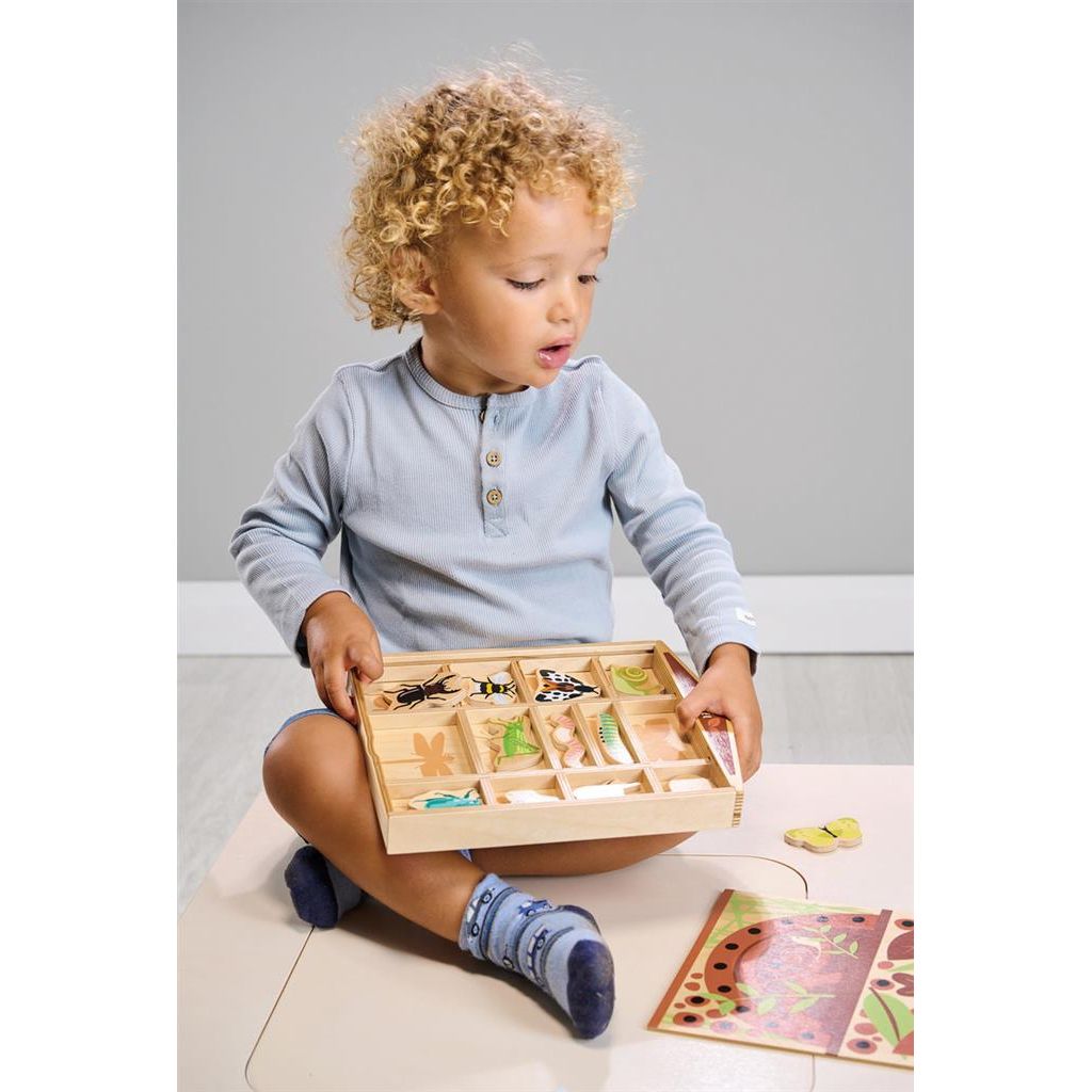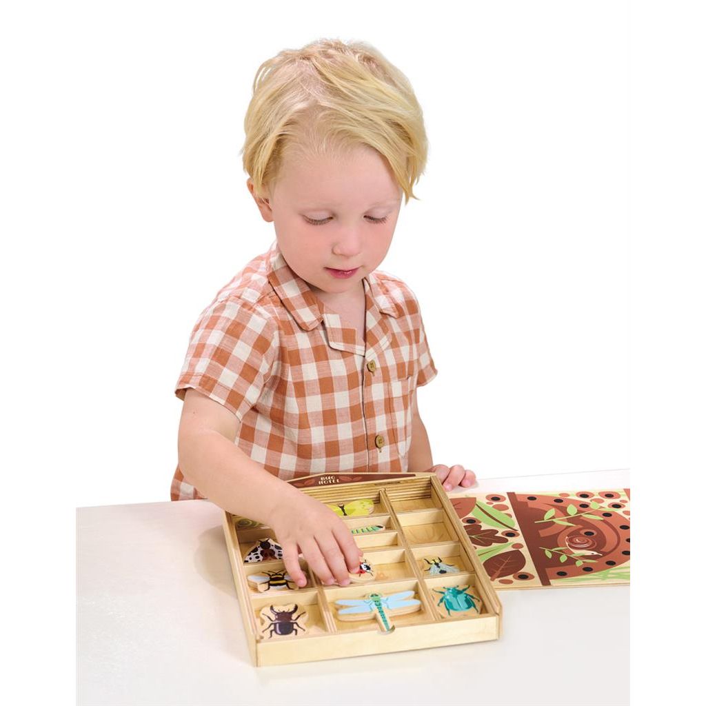 13 veelvoorkomende tuinwantsen zijn hier geïllustreerd op multiplex en zitten in hun eigen insectenhotel. De set bevat: slak, vlinder, lieveheersbeestje, mot, rups, worm, spin, hommel, sprinkhaan, vlieg, hertshoornkever, libel en scarabee. Onder elk stuk staat de naam.