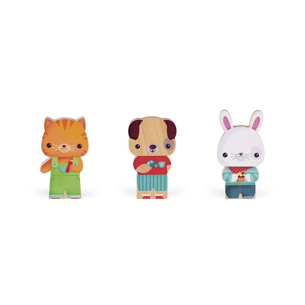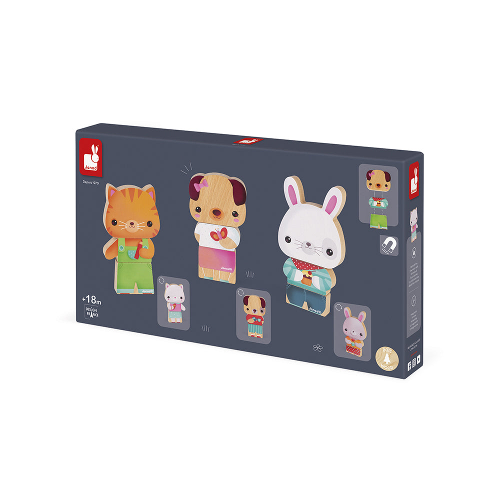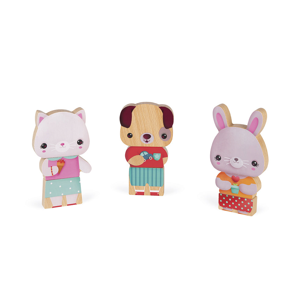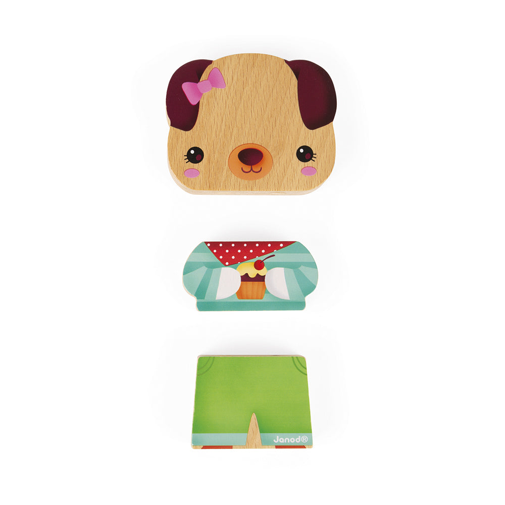 Houten speelgoed. Voor kinderen van 18 tot 36 maanden. 3 dieren in 3 magnetische delen: loshalen, creatief mixen en weer samenvoegen. Een leuk combinatie- en verbeeldingsspel.