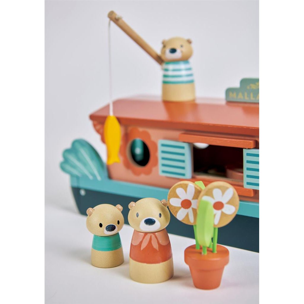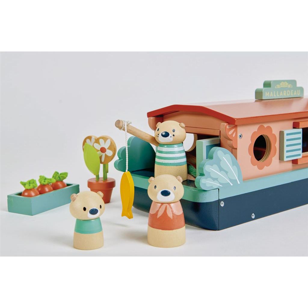 Maak kennis met onze nieuwe otterfamilie die op de rivier woont in een prachtige rondvaartboot genaamd "Mallardeau", genoemd naar hun favoriete wilde eend, die trots voorin zit aan het uiteinde van de boeg. Kijk eens naar het hengeltje achterop en het gestreepte stro dat dienst doet als schoorsteen. Het dak is afneembaar en de hut kan worden opgetild. Set bestaat uit: houtkachel, luciferdooslade, tafel met deksel van jampot met luciferpootjes, 3 flessendoppen, 3 gebreide slaapzakken, rij groenten, muurdecoratie van millard eend, bloempot, koffiepot en jampot.