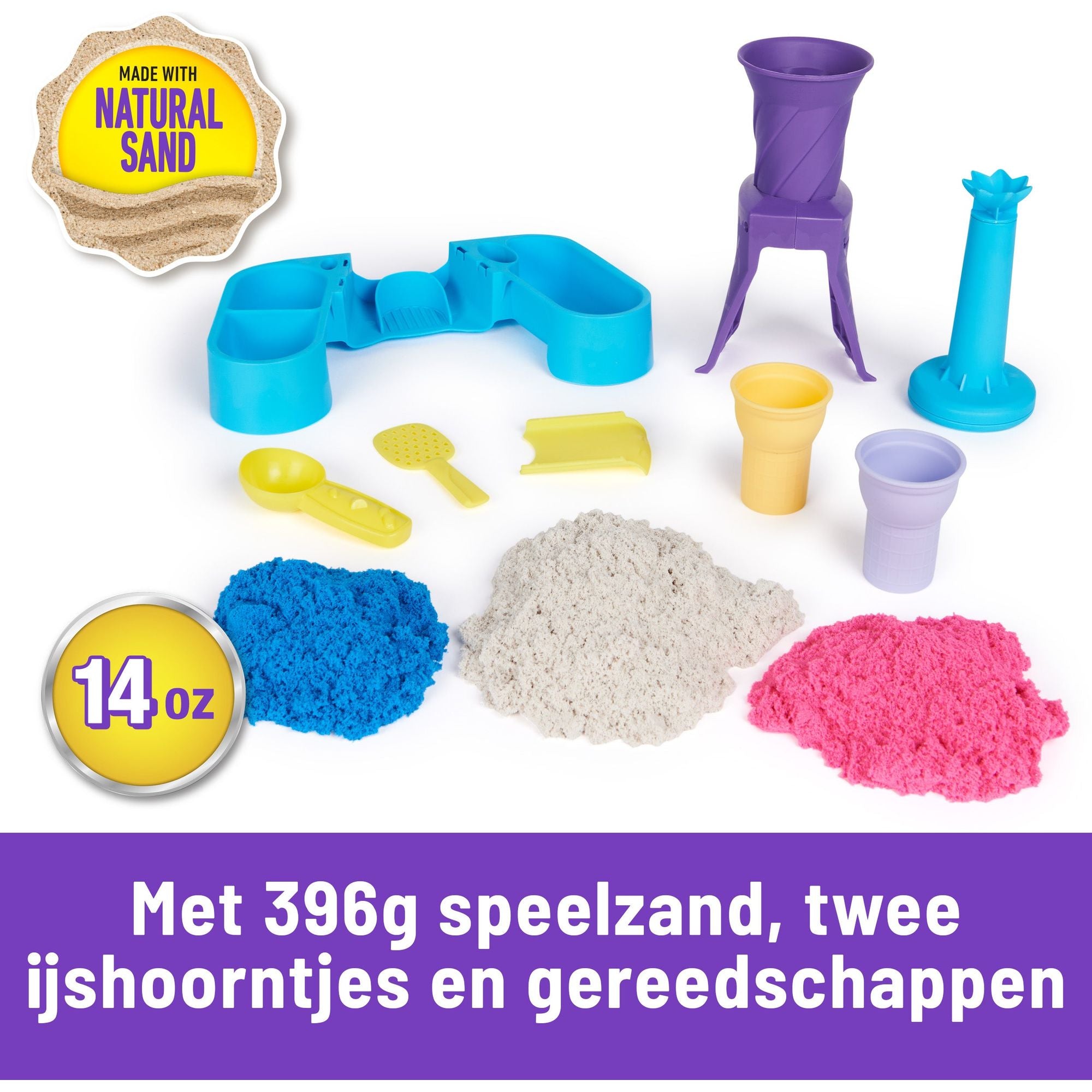 Inhoud: 396 g Kinetic Sand, 1 ijsschep met vormen, 2 ijshoorntjes, 1 softijsmachine, 1 rasp voor hageltjes, 1 gebruiksaanwijzing
