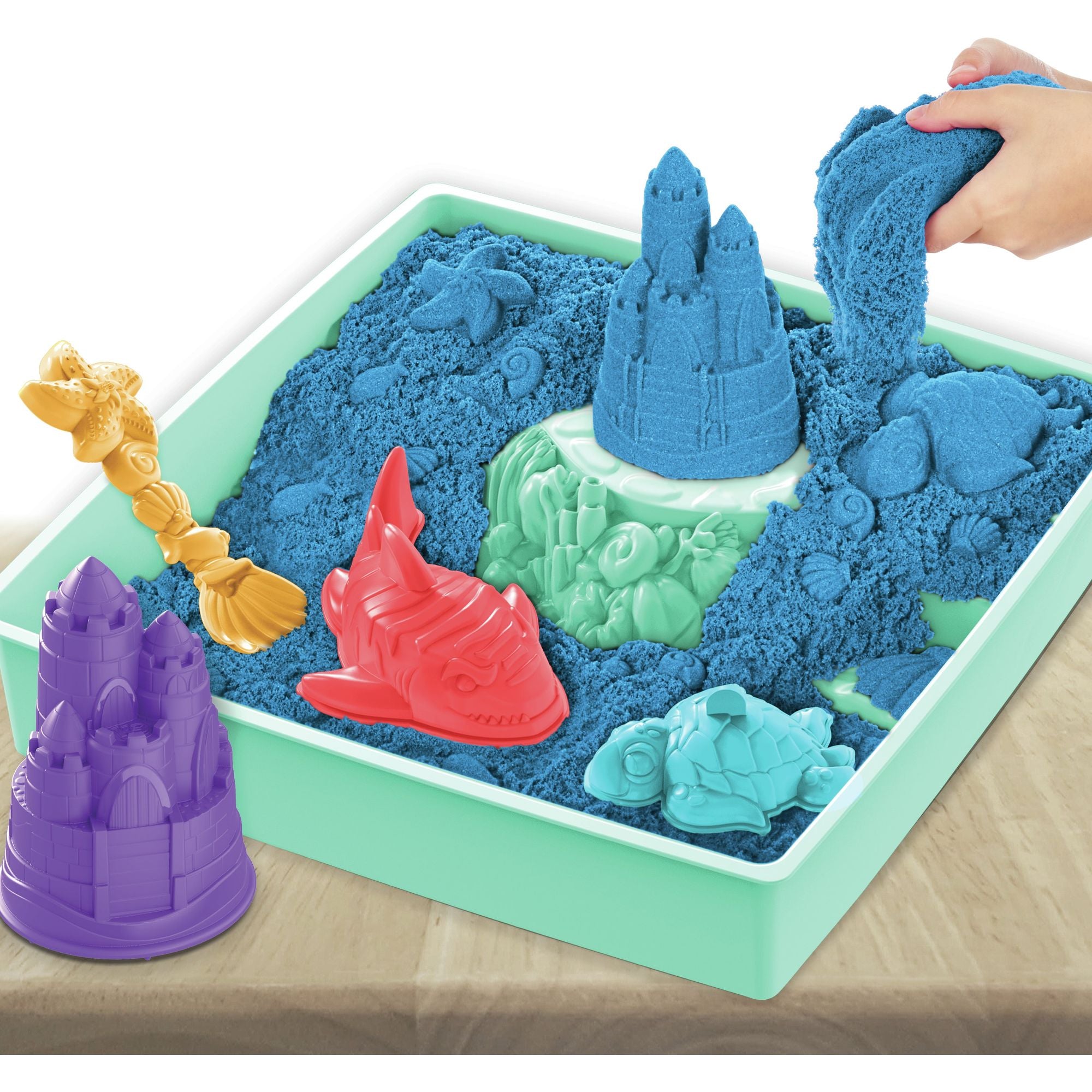 Inhoud: 454 g Kinetic Sand, 1 multitool, 1 schildpadvorm, 1 haaienvorm, 1 kasteelvorm, 1 tweelaagse herbruikbare bak