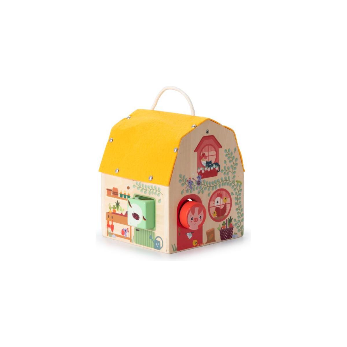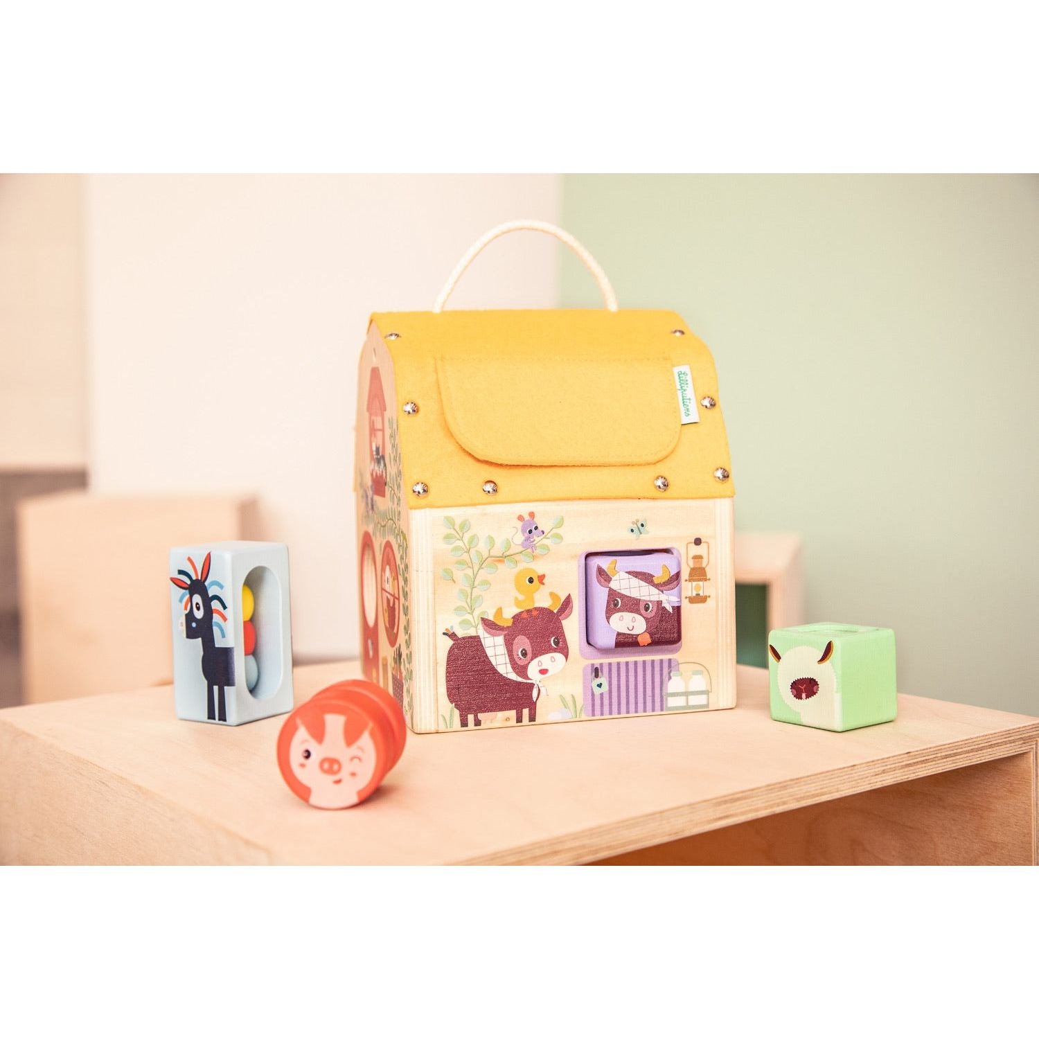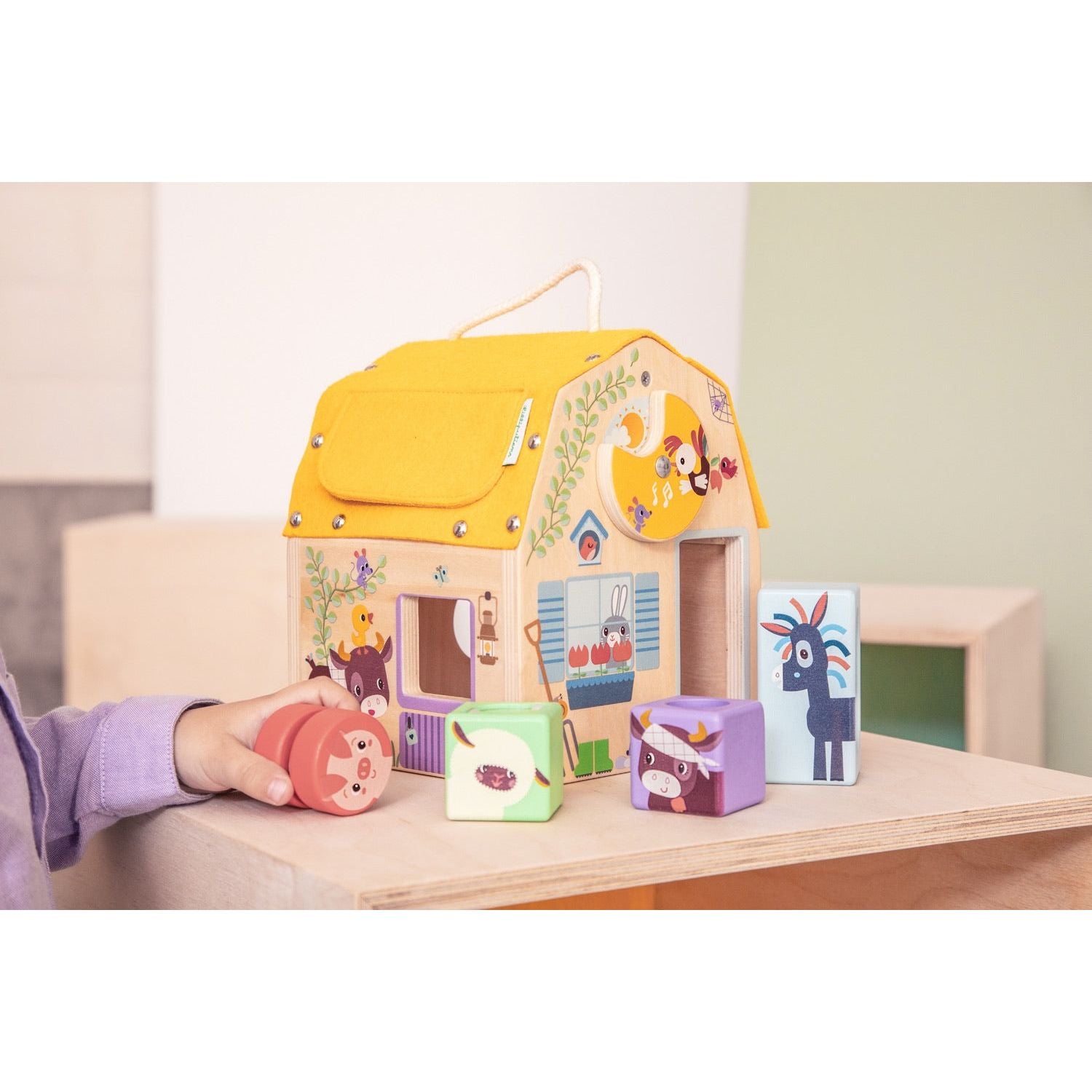 Het is feest op de boerderij. Door associatie van kleur en vorm help je de diertjes het huisje binnengaan. Elk dier heeft een aparte vorm en geluid. Een feest voor handjes, oortjes en brein.