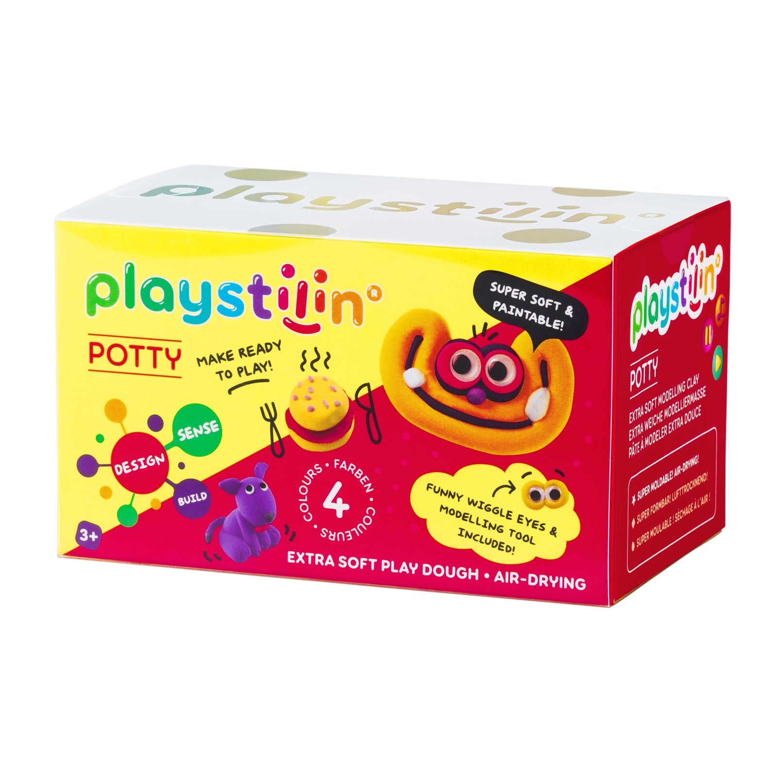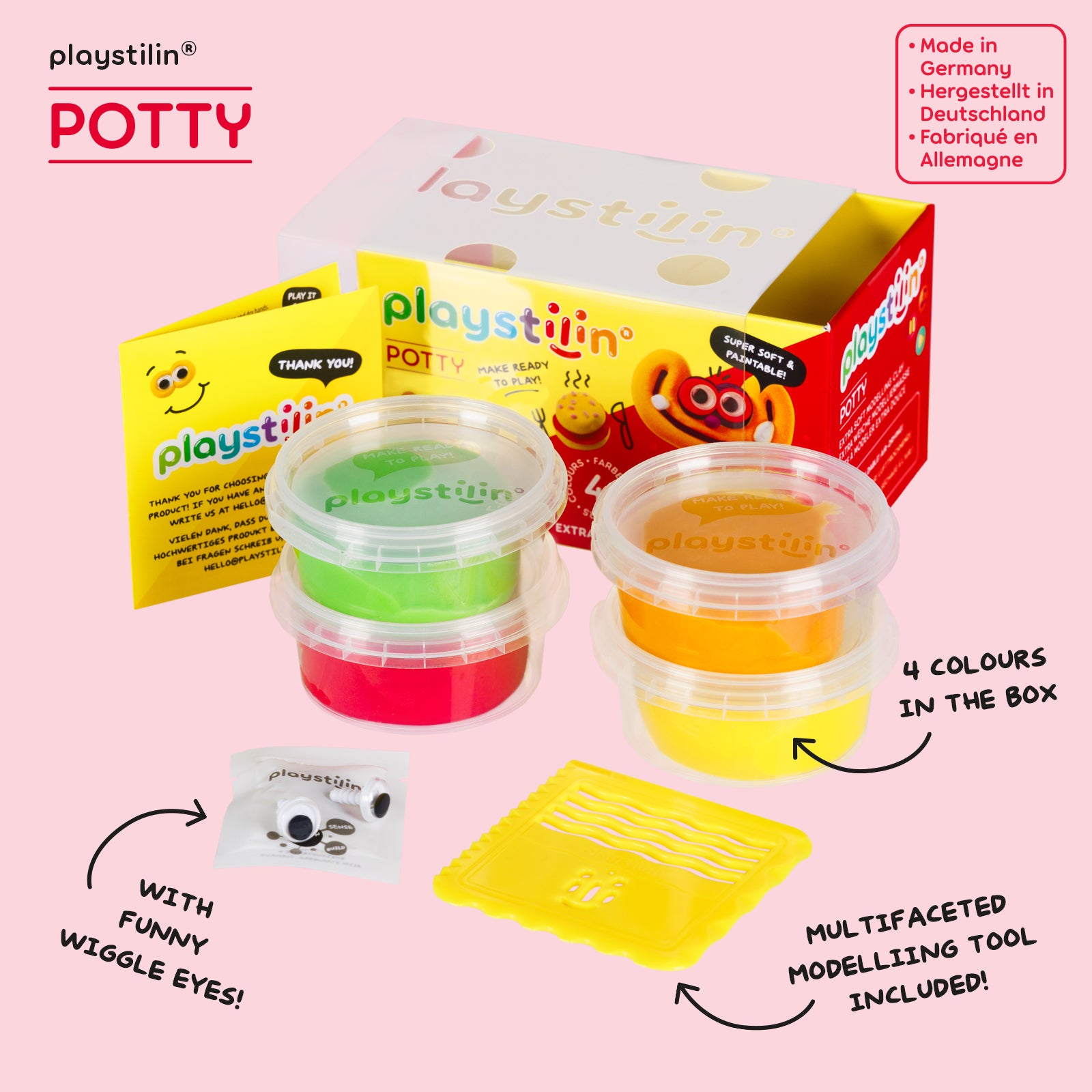 Playstilin® Potty is de extra zachte boetseerklei voor bijzonder tactiel boetseerplezier! Gewoon kneden, persen, rollen, uitsnijden en vormen! Omdat Playstilin® Potty aan de lucht droogt, is het ideaal om mee te knutselen en te creëren! De afgewerkte gedroogde kunstwerken kunnen vervolgens kleurrijk worden gedecoreerd en fantasierijk worden ontworpen met Playstilin® Loamy vingerverf! Om te bewaren of als zelfgemaakt cadeau gemaakt van klei!