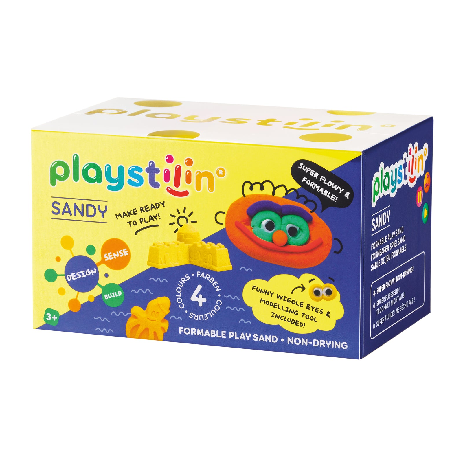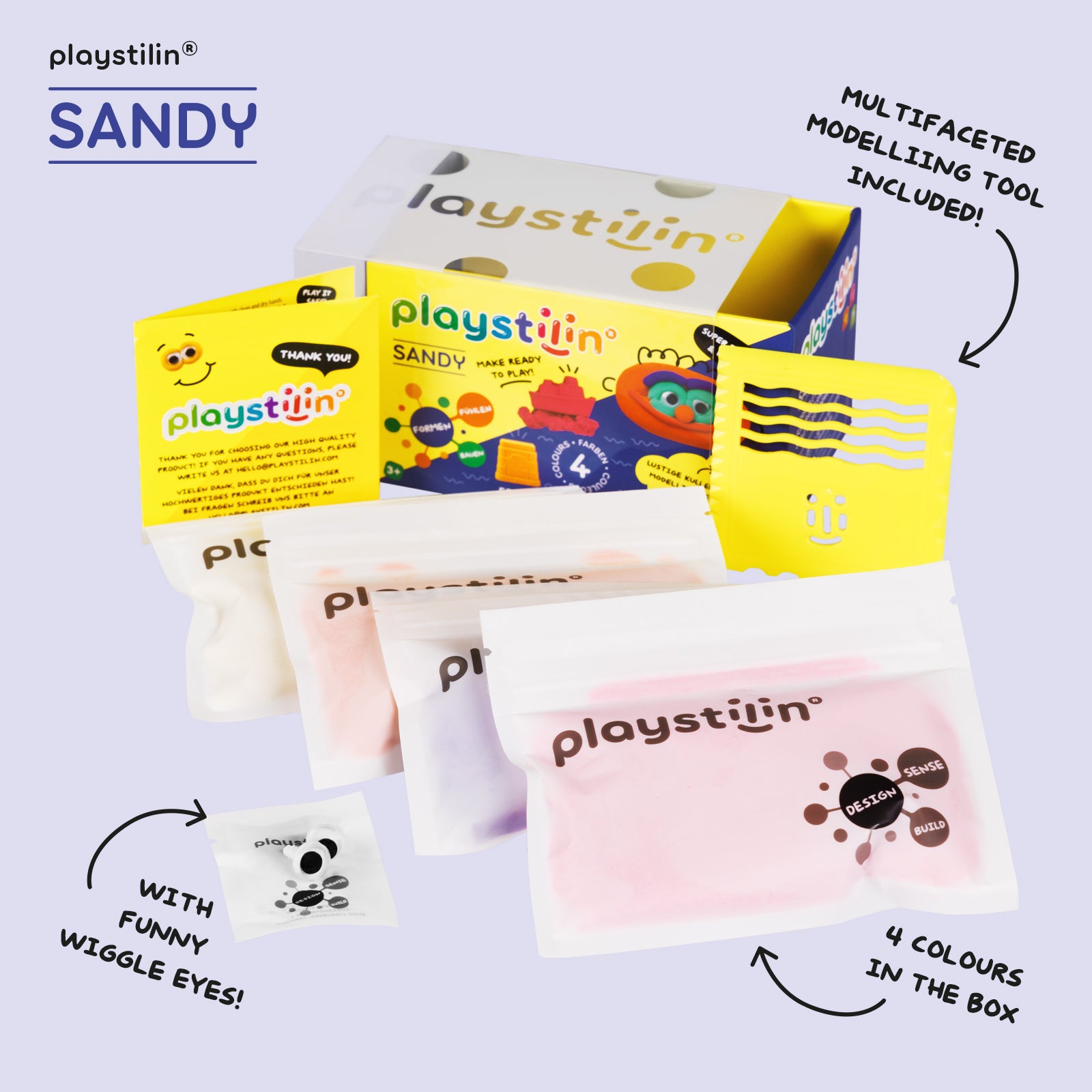 Playstilin® Sandy is het magische Sandy kinderspeeldeeg! Voelen, kneden, rollen, vormen, bouwen - en keer op keer laten stromen als zand! Droogt niet aan de lucht voor zandig kneden en speelplezier thuis of op school! Extra veilig en schoon! Het speciale speelgoed voor grote en kleine bouwers!