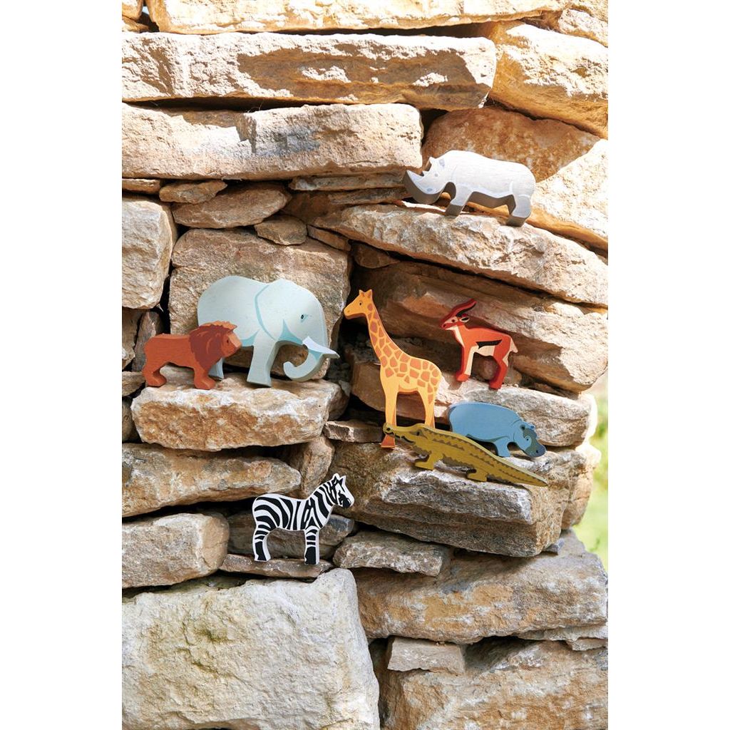 Traditionele en geliefde safaridieren gemaakt uit één stuk rubberhout. 1 van elk dier op een displayplank. (Krokodil, Zebra, Giraffe, Leeuw, Antilope, Olifant, Neushoorn, Nijlpaard). Gemaakt van duurzaam gewonnen rubberhout, dit is volledig plasticvrij massief houten milieuvriendelijk speelgoed!