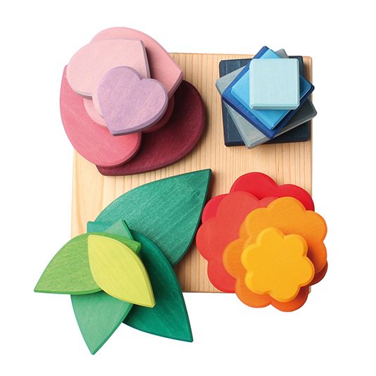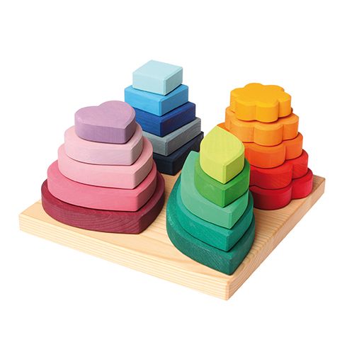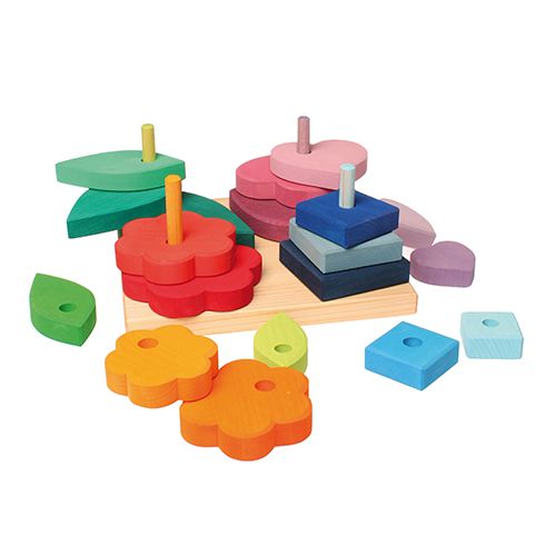 Sorteer de blokken op kleur en vorm, stapel een bloem of een huis en train je motoriek door de blokken op de sokkeltjes te plaatsen.Dit soort stapelspellen bestaan al bijna zolang als speelgoed bestaat, maar een uitvoering met zoveel mooie vormen en kleuren is wel heel bijzonder!Puur natuur en Duitse degelijkheid van Grimm's!