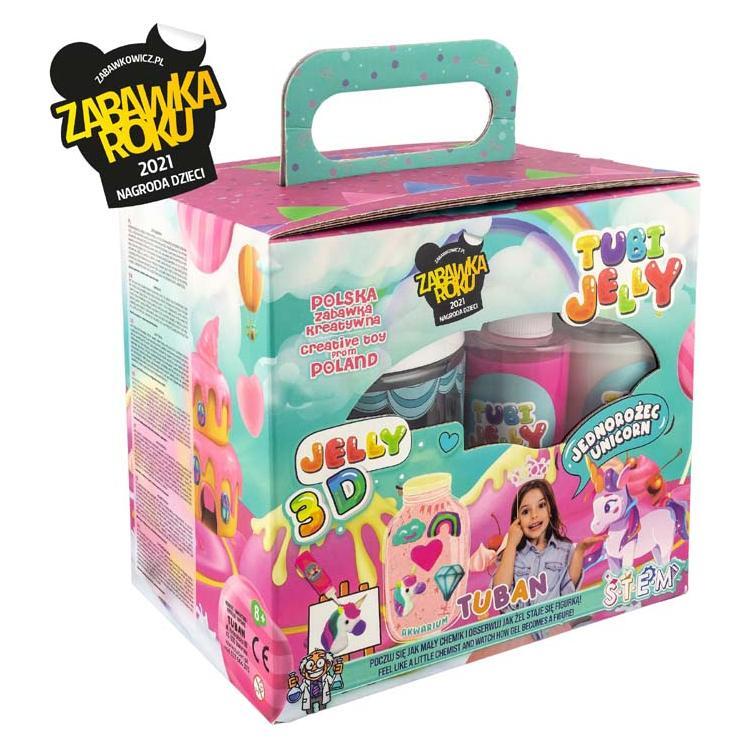 Maak 3D-gelfiguren! Tubi Jelly is creatief en fantasierijk plezier voor iedereen. De set bevat 6 kleurrijke gels, een aquarium met waterkristallen en tekensjablonen met eenhoornmotieven. Zodra je het sjabloon hebt ingevuld, dompel je het in de opgeloste activator en je figuur zal hard worden en klaar zijn om te spelen! Je kunt de geharde beeldjes in het meegeleverde vat met waterkristallen plaatsen en zo je eigen wereld vol eenhoorns creëren. Dankzij de meegeleverde lege folie kun je elk gelfiguur schilderen dat je maar kunt bedenken. Belangrijk: onze producten zijn veilig voor kinderen. Gemaakt in polen.