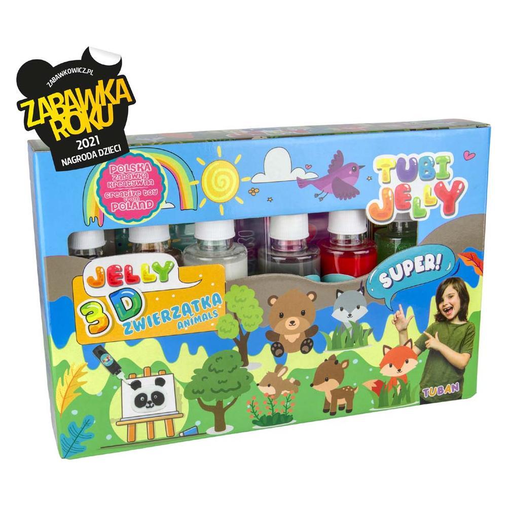 Maak 3D-gelfiguren! Tubi Jelly is creatief en fantasierijk plezier voor iedereen. De set bevat 6 gekleurde gels en tekensjablonen met dierenmotieven. Zodra je het sjabloon hebt ingevuld, dompel je het in de opgeloste activator en je figuur zal hard worden en klaar zijn om te spelen! Dankzij de meegeleverde blanco folie kun je elk gelfiguur tekenen en maken dat je maar wilt. Belangrijk: onze producten zijn veilig voor kinderen. Gemaakt in Polen.