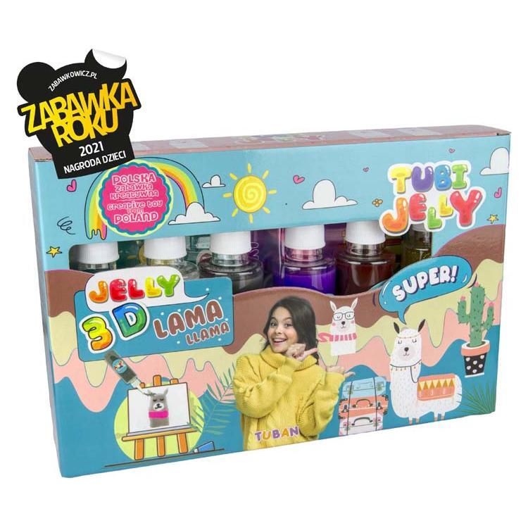 Maak 3D-gelfiguren! Tubi Jelly is creatief en fantasierijk plezier voor iedereen. De set bevat 6 gekleurde gels en tekensjablonen met schattige lama-motieven. Zodra je het sjabloon hebt ingevuld, dompel je het in de opgeloste activator en je figuur zal hard worden en klaar zijn om te spelen! Dankzij de meegeleverde blanco folie kun je elk gelfiguur tekenen en maken dat je maar wilt. Belangrijk: onze producten zijn veilig voor kinderen. Gemaakt in Polen.