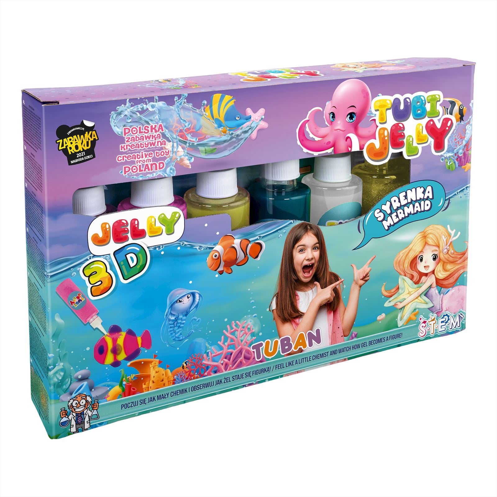 Maak 3D-gelfiguren! Tubi Jelly is creatief en fantasierijk plezier voor iedereen. De set bevat 6 gekleurde gels en tekensjablonen met zeemotieven. Zodra je het sjabloon hebt ingevuld, dompel je het in de opgeloste activator en je figuur zal hard worden en klaar zijn om te spelen! Dankzij de meegeleverde blanco folie kun je elk gelfiguur tekenen en maken dat je maar wilt. Belangrijk: onze producten zijn veilig voor kinderen. Gemaakt in Polen.
