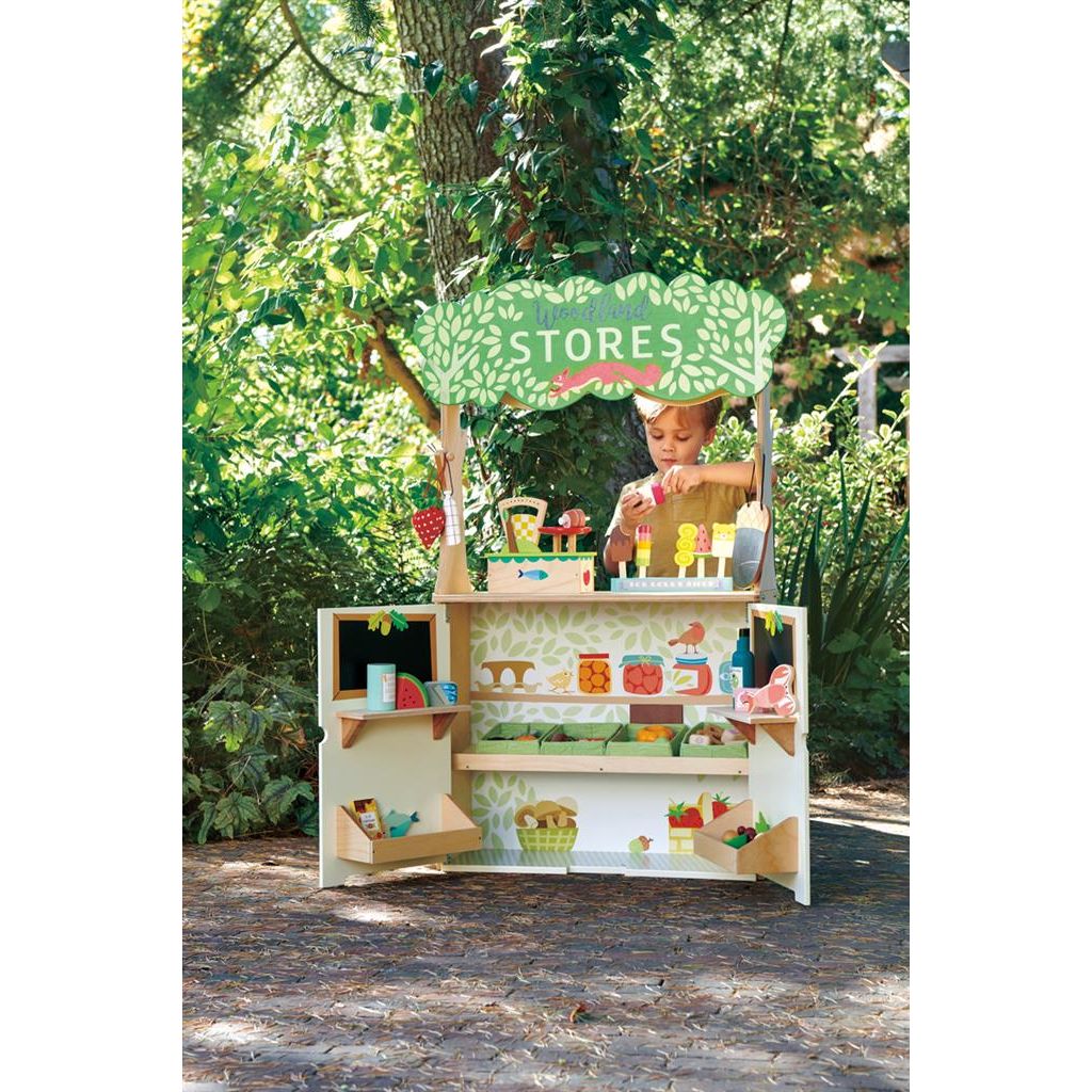 Een grote speelwinkel die aan beide kanten groepsspelen biedt. Aan de ene kant is het een speelwinkel van Woodland Stores - het heeft 2 deuren die uitkomen in een winkel en 2 schoolborden waarop gekrabbeld kan worden. Er is een gordijn dat omlaag kan om aan te geven dat de winkel gesloten is. Aan de achterkant van het bouwwerk verandert de winkel in een Woodland Theatre, en we hebben er 2 lieve bedrukte handpopjes bij gedaan. Er is een schoolbord met eikeltjes om een tijd en datum op te schrijven en het rode gordijn kan omhoog of omlaag voor de voorstelling.