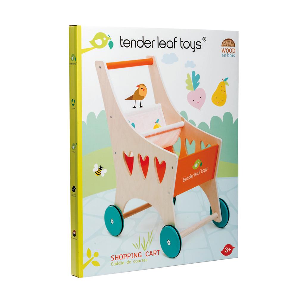 Een prachtig houten winkelwagentje met uitgesneden hartmotieven en een bedrukt stoffen vak.